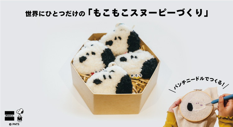 パンチニードルという技法を使って、もこもこしたかわいいスヌーピーを作れるワークショップです。子どもから大人まで楽しめる内容で、完成したスヌーピーは、好きな色のキーホルダーまたはバッジにできるので、身につけて楽しめますね。