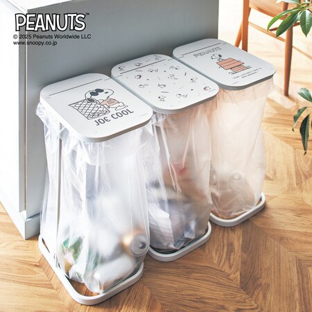 このゴミ袋ホルダー、スヌーピーのデザインがキッチンのアクセントに!シンプルな構造で、ゴミ袋をかけてフタをするだけ。30~45リットル対応だから、日常使いにぴったりです。